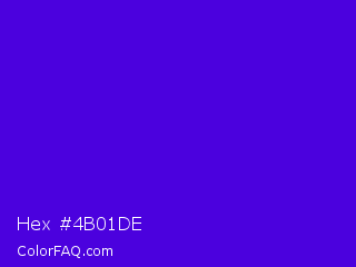Hex #4b01de Color is a normal indigo color and the nearest color is Interdimensional Blue #360ccc. Hex code #4b01de and RGB value is rgb(75,1,222). In RGB color space, this color is composed of 29% red, 0% green, 87% blue, In CMYK color space, this color is composed of 66% cyan, 100% magenta, 0% yellow , 13% black , In HSL color space, this color has a hue angle of 260° , 99% saturation and 44% lightness.