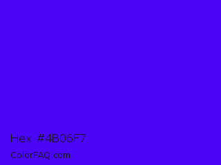 Hex #4b06f7 Color is a normal indigo color and the nearest color is Electric Ultramarine #3f00ff. Hex code #4b06f7 and RGB value is rgb(75,6,247). In RGB color space, this color is composed of 29% red, 2% green, 97% blue, In CMYK color space, this color is composed of 70% cyan, 98% magenta, 0% yellow , 3% black , In HSL color space, this color has a hue angle of 257° , 95% saturation and 50% lightness.