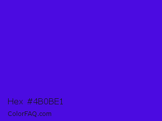 Hex #4b0be1 Color is a normal indigo color and the nearest color is Han Purple #5218fa. Hex code #4b0be1 and RGB value is rgb(75,11,225). In RGB color space, this color is composed of 29% red, 4% green, 88% blue, In CMYK color space, this color is composed of 67% cyan, 95% magenta, 0% yellow , 12% black , In HSL color space, this color has a hue angle of 258° , 91% saturation and 46% lightness.