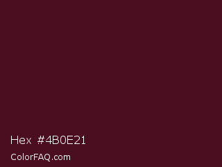 Hex #4b0e21 Color is a very dark rose color and the nearest color is Cab Sav #4d0a18. Hex code #4b0e21 and RGB value is rgb(75,14,33). In RGB color space, this color is composed of 29% red, 5% green, 13% blue, In CMYK color space, this color is composed of 0% cyan, 81% magenta, 56% yellow , 71% black , In HSL color space, this color has a hue angle of 341° , 69% saturation and 17% lightness.