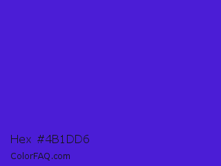 Hex #4b1dd6 Color is a normal indigo color and the nearest color is Interdimensional Blue #360ccc. Hex code #4b1dd6 and RGB value is rgb(75,29,214). In RGB color space, this color is composed of 29% red, 11% green, 84% blue, In CMYK color space, this color is composed of 65% cyan, 86% magenta, 0% yellow , 16% black , In HSL color space, this color has a hue angle of 255° , 76% saturation and 48% lightness.