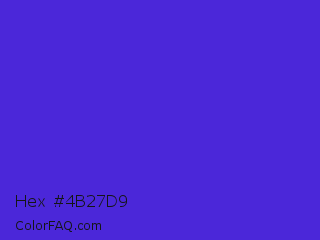 Hex #4b27d9 Color is a normal indigo color and the nearest color is Purple Heart Crayola #652dc1. Hex code #4b27d9 and RGB value is rgb(75,39,217). In RGB color space, this color is composed of 29% red, 15% green, 85% blue, In CMYK color space, this color is composed of 65% cyan, 82% magenta, 0% yellow , 15% black , In HSL color space, this color has a hue angle of 252° , 70% saturation and 50% lightness.