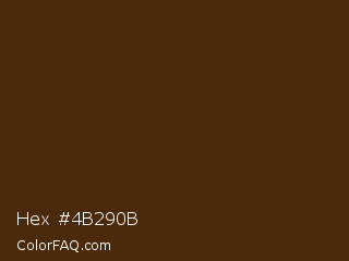 Hex #4b290b Color is a very dark orange color and the nearest color is Bracken #4a2a04. Hex code #4b290b and RGB value is rgb(75,41,11). In RGB color space, this color is composed of 29% red, 16% green, 4% blue, In CMYK color space, this color is composed of 0% cyan, 45% magenta, 85% yellow , 71% black , In HSL color space, this color has a hue angle of 28° , 74% saturation and 17% lightness.
