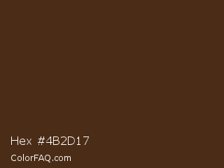 Hex #4b2d17 Color is a very dark orange color and the nearest color is Brown Derby #492615. Hex code #4b2d17 and RGB value is rgb(75,45,23). In RGB color space, this color is composed of 29% red, 18% green, 9% blue, In CMYK color space, this color is composed of 0% cyan, 40% magenta, 69% yellow , 71% black , In HSL color space, this color has a hue angle of 25° , 53% saturation and 19% lightness.