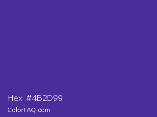 Hex #4b2d99 Color is a normal indigo color and the nearest color is Daisy Bush #4f2398. Hex code #4b2d99 and RGB value is rgb(75,45,153). In RGB color space, this color is composed of 29% red, 18% green, 60% blue, In CMYK color space, this color is composed of 51% cyan, 71% magenta, 0% yellow , 40% black , In HSL color space, this color has a hue angle of 257° , 55% saturation and 39% lightness.