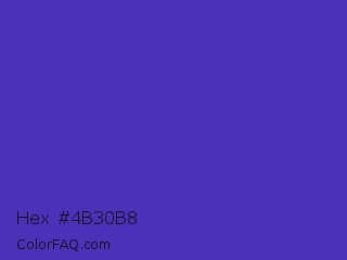 Hex #4b30b8 Color is a normal indigo color and the nearest color is Ocean Blue #4f42b5. Hex code #4b30b8 and RGB value is rgb(75,48,184). In RGB color space, this color is composed of 29% red, 19% green, 72% blue, In CMYK color space, this color is composed of 59% cyan, 74% magenta, 0% yellow , 28% black , In HSL color space, this color has a hue angle of 252° , 59% saturation and 45% lightness.