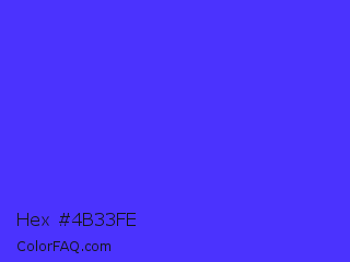Hex #4b33fe Color is a normal indigo color and the nearest color is Han Purple #5218fa. Hex code #4b33fe and RGB value is rgb(75,51,254). In RGB color space, this color is composed of 29% red, 20% green, 100% blue, In CMYK color space, this color is composed of 70% cyan, 80% magenta, 0% yellow , 0% black , In HSL color space, this color has a hue angle of 247° , 99% saturation and 60% lightness.