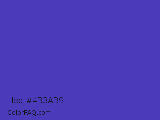 Hex #4b3ab9 Color is a normal indigo color and the nearest color is Ocean Blue #4f42b5. Hex code #4b3ab9 and RGB value is rgb(75,58,185). In RGB color space, this color is composed of 29% red, 23% green, 73% blue, In CMYK color space, this color is composed of 59% cyan, 69% magenta, 0% yellow , 27% black , In HSL color space, this color has a hue angle of 248° , 52% saturation and 48% lightness.