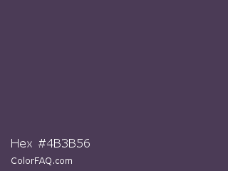 Hex #4b3b56 Color is a dark purple color and the nearest color is Voodoo #533455. Hex code #4b3b56 and RGB value is rgb(75,59,86). In RGB color space, this color is composed of 29% red, 23% green, 34% blue, In CMYK color space, this color is composed of 13% cyan, 31% magenta, 0% yellow , 66% black , In HSL color space, this color has a hue angle of 276° , 19% saturation and 28% lightness.