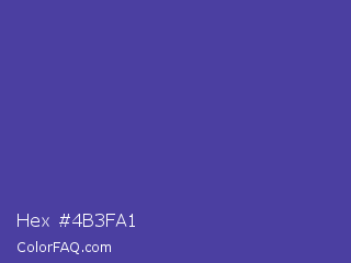 Hex #4b3fa1 Color is a normal indigo color and the nearest color is Gigas #523c94. Hex code #4b3fa1 and RGB value is rgb(75,63,161). In RGB color space, this color is composed of 29% red, 25% green, 63% blue, In CMYK color space, this color is composed of 53% cyan, 61% magenta, 0% yellow , 37% black , In HSL color space, this color has a hue angle of 247° , 44% saturation and 44% lightness.