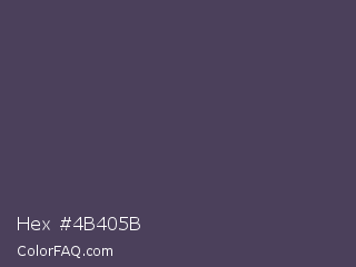 Hex #4b405b Color is a dark violet color and the nearest color is Mulled Wine #4e4562. Hex code #4b405b and RGB value is rgb(75,64,91). In RGB color space, this color is composed of 29% red, 25% green, 36% blue, In CMYK color space, this color is composed of 18% cyan, 30% magenta, 0% yellow , 64% black , In HSL color space, this color has a hue angle of 264° , 17% saturation and 30% lightness.