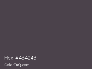 Hex #4b424b Color is a dark magenta color and the nearest color is Gravel #4a444b. Hex code #4b424b and RGB value is rgb(75,66,75). In RGB color space, this color is composed of 29% red, 26% green, 29% blue, In CMYK color space, this color is composed of 0% cyan, 12% magenta, 0% yellow , 71% black , In HSL color space, this color has a hue angle of 300° , 6% saturation and 28% lightness.