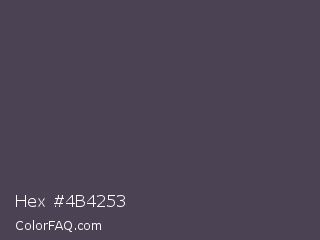 Hex #4b4253 Color is a dark purple color and the nearest color is Mortar #504351. Hex code #4b4253 and RGB value is rgb(75,66,83). In RGB color space, this color is composed of 29% red, 26% green, 33% blue, In CMYK color space, this color is composed of 10% cyan, 20% magenta, 0% yellow , 67% black , In HSL color space, this color has a hue angle of 272° , 11% saturation and 29% lightness.