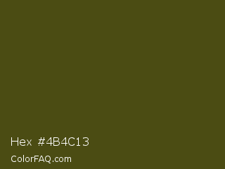 Hex #4b4c13 Color is a very dark yellow color and the nearest color is Bronze Olive #4e420c. Hex code #4b4c13 and RGB value is rgb(75,76,19). In RGB color space, this color is composed of 29% red, 30% green, 7% blue, In CMYK color space, this color is composed of 1% cyan, 0% magenta, 75% yellow , 70% black , In HSL color space, this color has a hue angle of 61° , 60% saturation and 19% lightness.