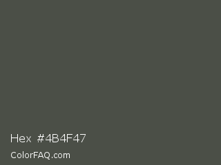 Hex #4b4f47 Color is a dark green color and the nearest color is Emperor #514649. Hex code #4b4f47 and RGB value is rgb(75,79,71). In RGB color space, this color is composed of 29% red, 31% green, 28% blue, In CMYK color space, this color is composed of 5% cyan, 0% magenta, 10% yellow , 69% black , In HSL color space, this color has a hue angle of 90° , 5% saturation and 29% lightness.