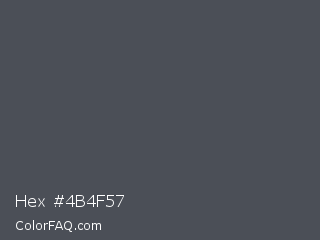 Hex #4b4f57 Color is a normal blue color and the nearest color is Abbey #4c4f56. Hex code #4b4f57 and RGB value is rgb(75,79,87). In RGB color space, this color is composed of 29% red, 31% green, 34% blue, In CMYK color space, this color is composed of 14% cyan, 9% magenta, 0% yellow , 66% black , In HSL color space, this color has a hue angle of 220° , 7% saturation and 32% lightness.