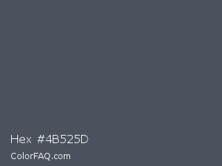 Hex #4b525d Color is a normal blue color and the nearest color is Trout #4a4e5a. Hex code #4b525d and RGB value is rgb(75,82,93). In RGB color space, this color is composed of 29% red, 32% green, 36% blue, In CMYK color space, this color is composed of 19% cyan, 12% magenta, 0% yellow , 64% black , In HSL color space, this color has a hue angle of 217° , 11% saturation and 33% lightness.
