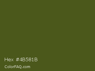 Hex #4b581b Color is a dark lime color and the nearest color is Army Green #4b5320. Hex code #4b581b and RGB value is rgb(75,88,27). In RGB color space, this color is composed of 29% red, 35% green, 11% blue, In CMYK color space, this color is composed of 15% cyan, 0% magenta, 69% yellow , 65% black , In HSL color space, this color has a hue angle of 73° , 53% saturation and 23% lightness.