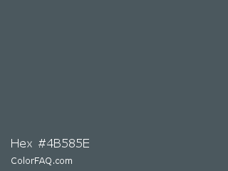 Hex #4b585e Color is a normal blue color and the nearest color is Trout #4a4e5a. Hex code #4b585e and RGB value is rgb(75,88,94). In RGB color space, this color is composed of 29% red, 35% green, 37% blue, In CMYK color space, this color is composed of 20% cyan, 6% magenta, 0% yellow , 63% black , In HSL color space, this color has a hue angle of 199° , 11% saturation and 33% lightness.