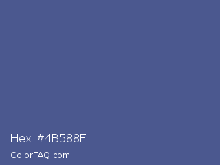 Hex #4b588f Color is a normal blue color and the nearest color is Purple Navy #4e5180. Hex code #4b588f and RGB value is rgb(75,88,143). In RGB color space, this color is composed of 29% red, 35% green, 56% blue, In CMYK color space, this color is composed of 48% cyan, 38% magenta, 0% yellow , 44% black , In HSL color space, this color has a hue angle of 229° , 31% saturation and 43% lightness.