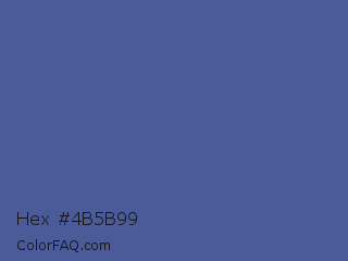 Hex #4b5b99 Color is a normal blue color and the nearest color is UCLA Blue #536895. Hex code #4b5b99 and RGB value is rgb(75,91,153). In RGB color space, this color is composed of 29% red, 36% green, 60% blue, In CMYK color space, this color is composed of 51% cyan, 41% magenta, 0% yellow , 40% black , In HSL color space, this color has a hue angle of 228° , 34% saturation and 45% lightness.