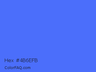 Hex #4b6efb Color is a light blue color and the nearest color is Ultramarine Blue #4166f5. Hex code #4b6efb and RGB value is rgb(75,110,251). In RGB color space, this color is composed of 29% red, 43% green, 98% blue, In CMYK color space, this color is composed of 70% cyan, 56% magenta, 0% yellow , 2% black , In HSL color space, this color has a hue angle of 228° , 96% saturation and 64% lightness.