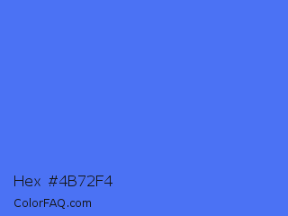 Hex #4b72f4 Color is a light blue color and the nearest color is Ultramarine Blue #4166f5. Hex code #4b72f4 and RGB value is rgb(75,114,244). In RGB color space, this color is composed of 29% red, 45% green, 96% blue, In CMYK color space, this color is composed of 69% cyan, 53% magenta, 0% yellow , 4% black , In HSL color space, this color has a hue angle of 226° , 88% saturation and 63% lightness.