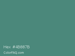 Hex #4b887b Color is a normal cyan color and the nearest color is Wintergreen Dream #56887d. Hex code #4b887b and RGB value is rgb(75,136,123). In RGB color space, this color is composed of 29% red, 53% green, 48% blue, In CMYK color space, this color is composed of 45% cyan, 0% magenta, 10% yellow , 47% black , In HSL color space, this color has a hue angle of 167° , 29% saturation and 41% lightness.