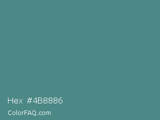 Hex #4b8886 Color is a normal cyan color and the nearest color is Smalt Blue #51808f. Hex code #4b8886 and RGB value is rgb(75,136,134). In RGB color space, this color is composed of 29% red, 53% green, 53% blue, In CMYK color space, this color is composed of 45% cyan, 0% magenta, 1% yellow , 47% black , In HSL color space, this color has a hue angle of 178° , 29% saturation and 41% lightness.
