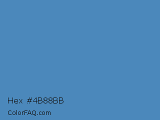Hex #4b88bb Color is a normal blue color and the nearest color is Cyan Blue Azure #4682bf. Hex code #4b88bb and RGB value is rgb(75,136,187). In RGB color space, this color is composed of 29% red, 53% green, 73% blue, In CMYK color space, this color is composed of 60% cyan, 27% magenta, 0% yellow , 27% black , In HSL color space, this color has a hue angle of 207° , 45% saturation and 51% lightness.