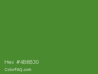 Hex #4b8b30 Color is a normal green color and the nearest color is Sap Green #507d2a. Hex code #4b8b30 and RGB value is rgb(75,139,48). In RGB color space, this color is composed of 29% red, 55% green, 19% blue, In CMYK color space, this color is composed of 46% cyan, 0% magenta, 65% yellow , 45% black , In HSL color space, this color has a hue angle of 102° , 49% saturation and 37% lightness.
