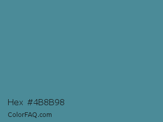 Hex #4b8b98 Color is a normal cyan color and the nearest color is Wedgewood #4e7f9e. Hex code #4b8b98 and RGB value is rgb(75,139,152). In RGB color space, this color is composed of 29% red, 55% green, 60% blue, In CMYK color space, this color is composed of 51% cyan, 9% magenta, 0% yellow , 40% black , In HSL color space, this color has a hue angle of 190° , 34% saturation and 45% lightness.