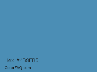 Hex #4b8eb5 Color is a normal blue color and the nearest color is Cyan Azure #4e82b4. Hex code #4b8eb5 and RGB value is rgb(75,142,181). In RGB color space, this color is composed of 29% red, 56% green, 71% blue, In CMYK color space, this color is composed of 59% cyan, 22% magenta, 0% yellow , 29% black , In HSL color space, this color has a hue angle of 202° , 42% saturation and 50% lightness.
