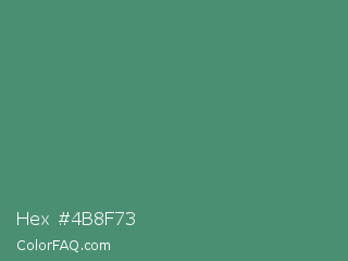 Hex #4b8f73 Color is a normal green color and the nearest color is Wintergreen Dream #56887d. Hex code #4b8f73 and RGB value is rgb(75,143,115). In RGB color space, this color is composed of 29% red, 56% green, 45% blue, In CMYK color space, this color is composed of 48% cyan, 0% magenta, 20% yellow , 44% black , In HSL color space, this color has a hue angle of 155° , 31% saturation and 43% lightness.