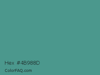 Hex #4b988d Color is a normal cyan color and the nearest color is Polished Pine #5da493. Hex code #4b988d and RGB value is rgb(75,152,141). In RGB color space, this color is composed of 29% red, 60% green, 55% blue, In CMYK color space, this color is composed of 51% cyan, 0% magenta, 7% yellow , 40% black , In HSL color space, this color has a hue angle of 171° , 34% saturation and 45% lightness.