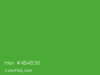 Hex #4bab36 Color is a normal green color and the nearest color is Apple #4fa83d. Hex code #4bab36 and RGB value is rgb(75,171,54). In RGB color space, this color is composed of 29% red, 67% green, 21% blue, In CMYK color space, this color is composed of 56% cyan, 0% magenta, 68% yellow , 33% black , In HSL color space, this color has a hue angle of 109° , 52% saturation and 44% lightness.