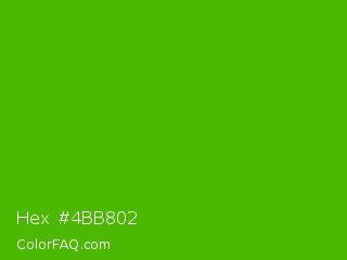 Hex #4bb802 Color is a normal green color and the nearest color is Kelly Green #4cbb17. Hex code #4bb802 and RGB value is rgb(75,184,2). In RGB color space, this color is composed of 29% red, 72% green, 1% blue, In CMYK color space, this color is composed of 59% cyan, 0% magenta, 99% yellow , 28% black , In HSL color space, this color has a hue angle of 96° , 98% saturation and 36% lightness.