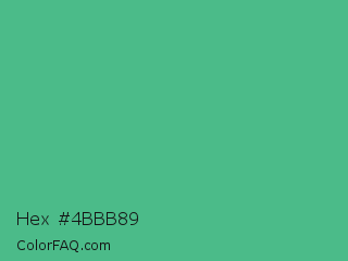 Hex #4bbb89 Color is a normal green color and the nearest color is Ocean Green #48bf91. Hex code #4bbb89 and RGB value is rgb(75,187,137). In RGB color space, this color is composed of 29% red, 73% green, 54% blue, In CMYK color space, this color is composed of 60% cyan, 0% magenta, 27% yellow , 27% black , In HSL color space, this color has a hue angle of 153° , 45% saturation and 51% lightness.