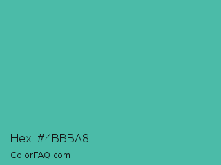 Hex #4bbba8 Color is a normal cyan color and the nearest color is Verdigris #43b3ae. Hex code #4bbba8 and RGB value is rgb(75,187,168). In RGB color space, this color is composed of 29% red, 73% green, 66% blue, In CMYK color space, this color is composed of 60% cyan, 0% magenta, 10% yellow , 27% black , In HSL color space, this color has a hue angle of 170° , 45% saturation and 51% lightness.