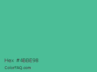 Hex #4bbe98 Color is a normal green color and the nearest color is Ocean Green #48bf91. Hex code #4bbe98 and RGB value is rgb(75,190,152). In RGB color space, this color is composed of 29% red, 75% green, 60% blue, In CMYK color space, this color is composed of 61% cyan, 0% magenta, 20% yellow , 25% black , In HSL color space, this color has a hue angle of 160° , 47% saturation and 52% lightness.