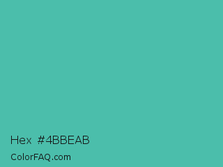 Hex #4bbeab Color is a normal cyan color and the nearest color is Puerto Rico #3fc1aa. Hex code #4bbeab and RGB value is rgb(75,190,171). In RGB color space, this color is composed of 29% red, 75% green, 67% blue, In CMYK color space, this color is composed of 61% cyan, 0% magenta, 10% yellow , 25% black , In HSL color space, this color has a hue angle of 170° , 47% saturation and 52% lightness.