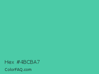 Hex #4bcba7 Color is a normal green color and the nearest color is Eucalyptus #44d7a8. Hex code #4bcba7 and RGB value is rgb(75,203,167). In RGB color space, this color is composed of 29% red, 80% green, 65% blue, In CMYK color space, this color is composed of 63% cyan, 0% magenta, 18% yellow , 20% black , In HSL color space, this color has a hue angle of 163° , 55% saturation and 55% lightness.