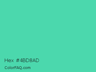 Hex #4bd8ad Color is a normal green color and the nearest color is Eucalyptus #44d7a8. Hex code #4bd8ad and RGB value is rgb(75,216,173). In RGB color space, this color is composed of 29% red, 85% green, 68% blue, In CMYK color space, this color is composed of 65% cyan, 0% magenta, 20% yellow , 15% black , In HSL color space, this color has a hue angle of 162° , 64% saturation and 57% lightness.