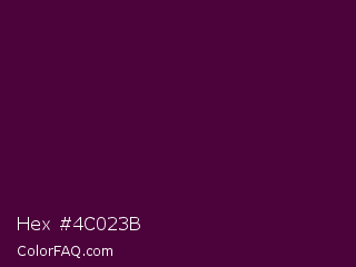 Hex #4c023b Color is a very dark magenta color and the nearest color is Blackberry #4d0135. Hex code #4c023b and RGB value is rgb(76,2,59). In RGB color space, this color is composed of 30% red, 1% green, 23% blue, In CMYK color space, this color is composed of 0% cyan, 97% magenta, 22% yellow , 70% black , In HSL color space, this color has a hue angle of 314° , 95% saturation and 15% lightness.