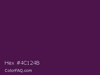 Hex #4c124b Color is a very dark magenta color and the nearest color is Loulou #460b41. Hex code #4c124b and RGB value is rgb(76,18,75). In RGB color space, this color is composed of 30% red, 7% green, 29% blue, In CMYK color space, this color is composed of 0% cyan, 76% magenta, 1% yellow , 70% black , In HSL color space, this color has a hue angle of 301° , 62% saturation and 18% lightness.