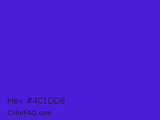 Hex #4c1dd8 Color is a normal indigo color and the nearest color is Interdimensional Blue #360ccc. Hex code #4c1dd8 and RGB value is rgb(76,29,216). In RGB color space, this color is composed of 30% red, 11% green, 85% blue, In CMYK color space, this color is composed of 65% cyan, 87% magenta, 0% yellow , 15% black , In HSL color space, this color has a hue angle of 255° , 76% saturation and 48% lightness.