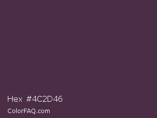 Hex #4c2d46 Color is a dark magenta color and the nearest color is Matterhorn #4e3b41. Hex code #4c2d46 and RGB value is rgb(76,45,70). In RGB color space, this color is composed of 30% red, 18% green, 27% blue, In CMYK color space, this color is composed of 0% cyan, 41% magenta, 8% yellow , 70% black , In HSL color space, this color has a hue angle of 312° , 26% saturation and 24% lightness.