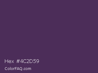 Hex #4c2d59 Color is a dark purple color and the nearest color is Bossanova #4e2a5a. Hex code #4c2d59 and RGB value is rgb(76,45,89). In RGB color space, this color is composed of 30% red, 18% green, 35% blue, In CMYK color space, this color is composed of 15% cyan, 49% magenta, 0% yellow , 65% black , In HSL color space, this color has a hue angle of 282° , 33% saturation and 26% lightness.