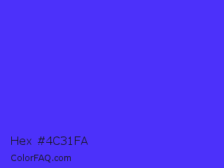 Hex #4c31fa Color is a normal indigo color and the nearest color is Han Purple #5218fa. Hex code #4c31fa and RGB value is rgb(76,49,250). In RGB color space, this color is composed of 30% red, 19% green, 98% blue, In CMYK color space, this color is composed of 70% cyan, 80% magenta, 0% yellow , 2% black , In HSL color space, this color has a hue angle of 248° , 95% saturation and 59% lightness.