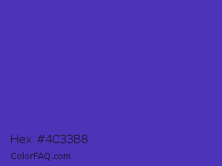 Hex #4c33b8 Color is a normal indigo color and the nearest color is Ocean Blue #4f42b5. Hex code #4c33b8 and RGB value is rgb(76,51,184). In RGB color space, this color is composed of 30% red, 20% green, 72% blue, In CMYK color space, this color is composed of 59% cyan, 72% magenta, 0% yellow , 28% black , In HSL color space, this color has a hue angle of 251° , 57% saturation and 46% lightness.
